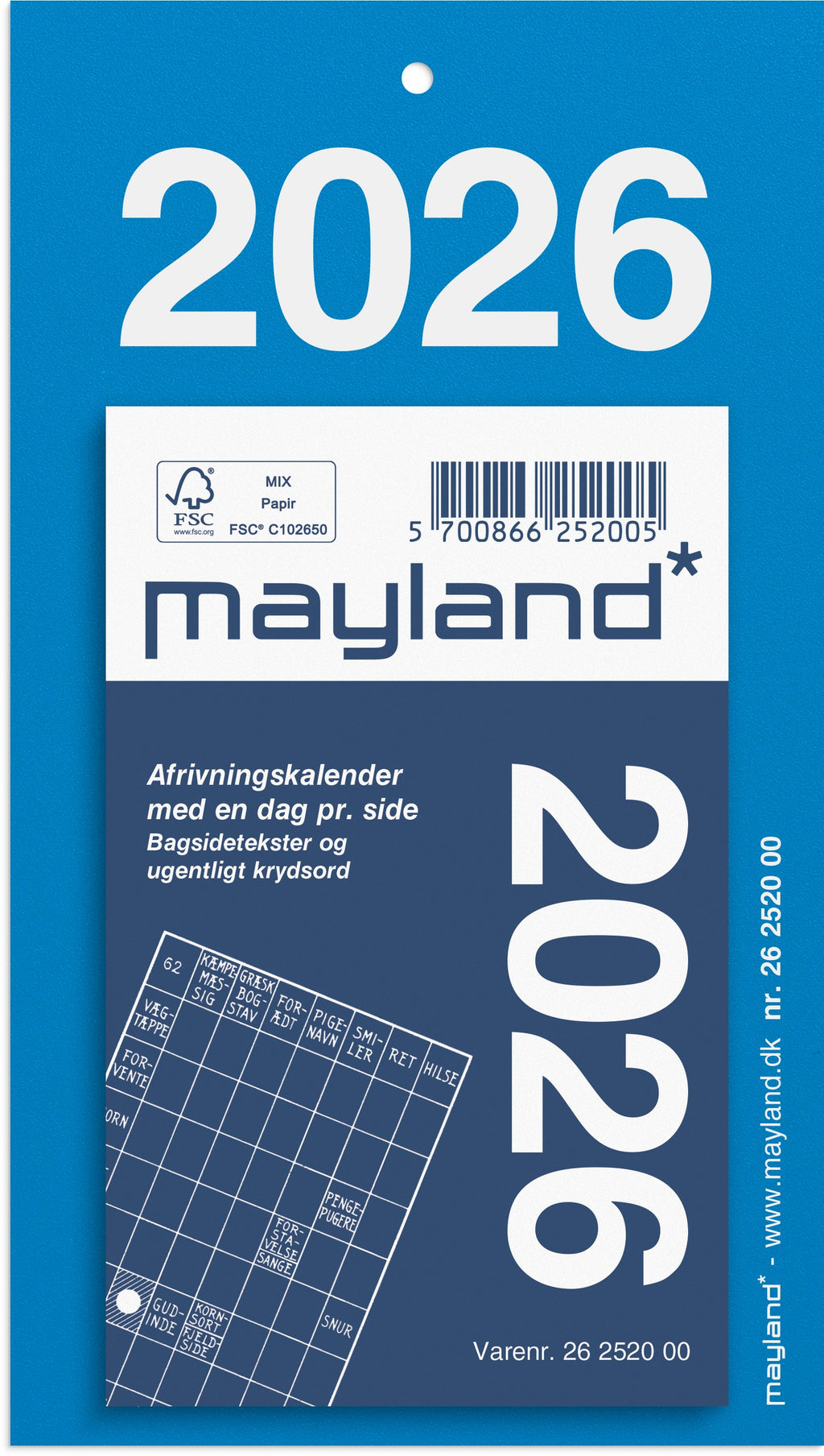 Afrivningskalender til vægophæng. Den smarte vægkalender har et praktisk blokformat, hvor hver side nemt kan rives af blokken, når dagen er gået. Afrivningskalenderen har et enkelt og moderne design med en blå baggrund og har bagsidetekster og et ugentligt krydsord.