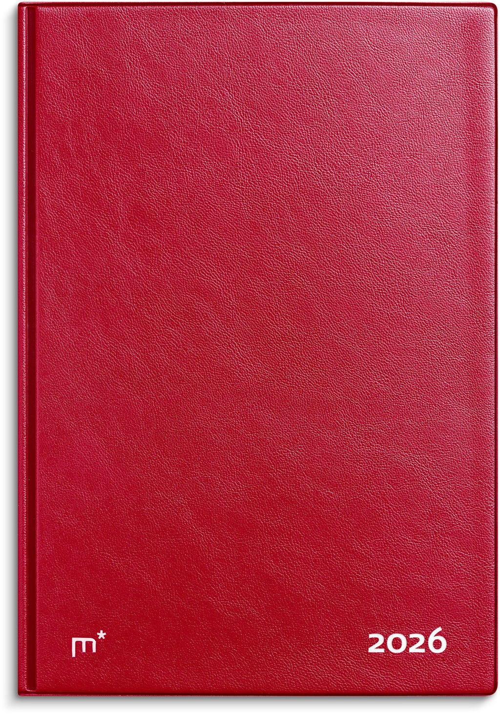 Kalenderen er indbundet med et omslag i rød vinyl, som giver den et flot og enkelt udseende. Kalenderen er inddelt med en uge pr. opslag og indeholder et funktionelt, overskueligt og timeopdelt kalenderskema fra kl. 8-18. Kalenderskemaet er designet med masser af linjer, så der er plads til at holde styr på ugens planer og aftaler. Dertil finder du en tidslinje og månedsoversigt nederst på hvert opslag, årsoversigter for tre år, særtjenestenumre og telefonselvvalg, adresse- og telefonregister samt et hæfte til fødselsdage og mærkedage indsat bagerst i en lomme.
