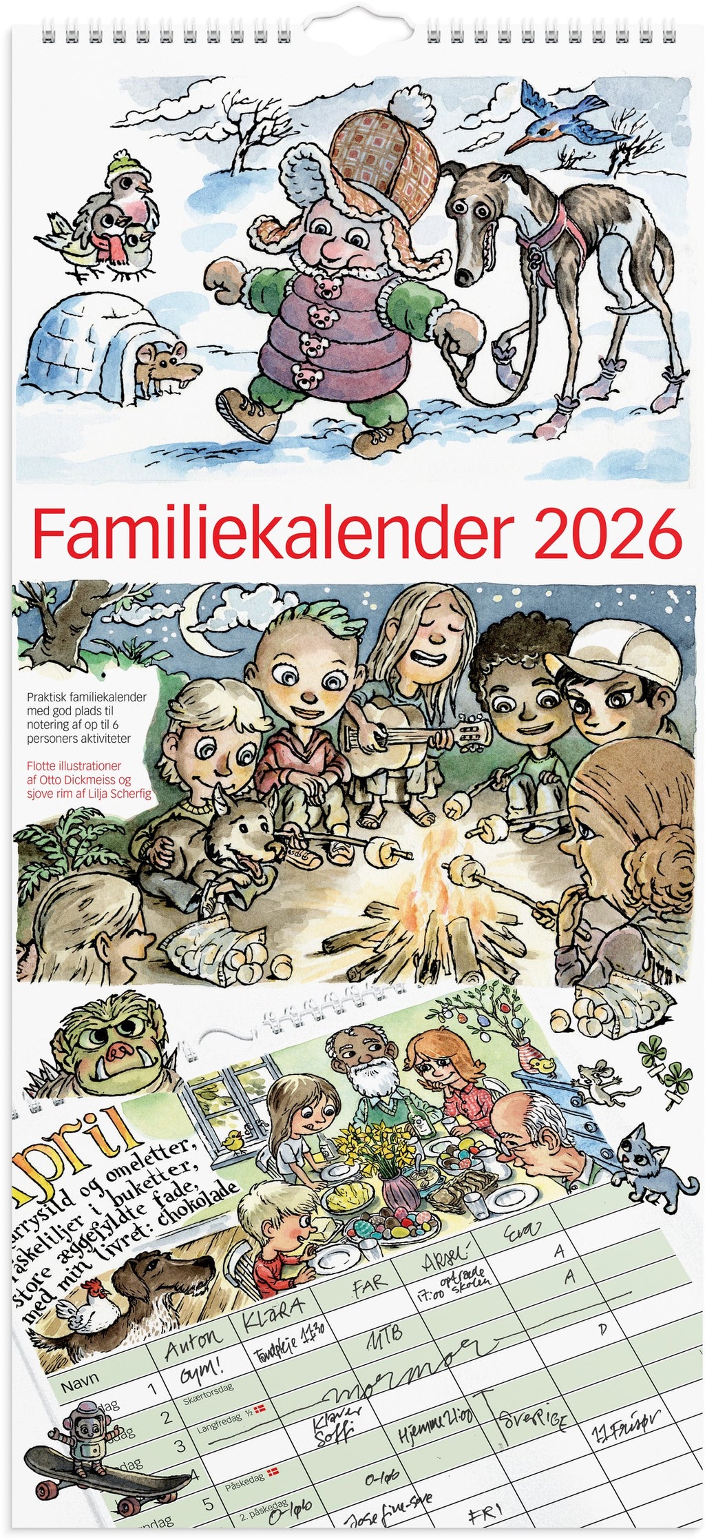 Familiekalender i praktisk og smart design. Kalenderen er inddelt med en måned pr. side. Hver måned er opdelt i 6 kolonner, så hvert familiemedlem har sin egen kolonne hver dag. På den måde kan du hurtigt og nemt skabe et overskueligt overblik over hele familiens aktiviteter og aftaler. Kalenderen har flotte illustrationer af Otto Dickmeiss og sjove rim af Lilja Scherfig og indeholder månedsopslag.