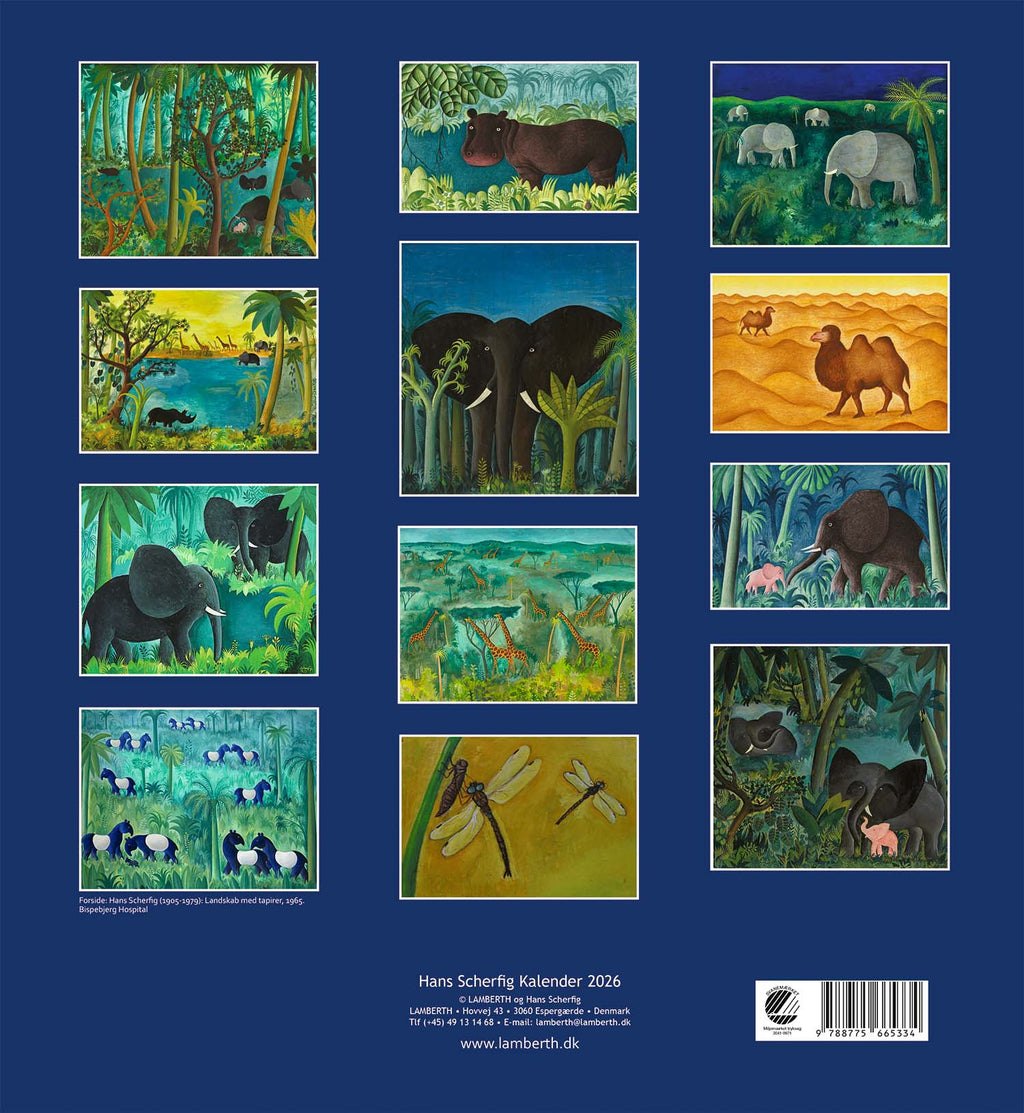 Stor og flot kalender med Hans Scherfigs farverige motiver fra jungle og savanne.