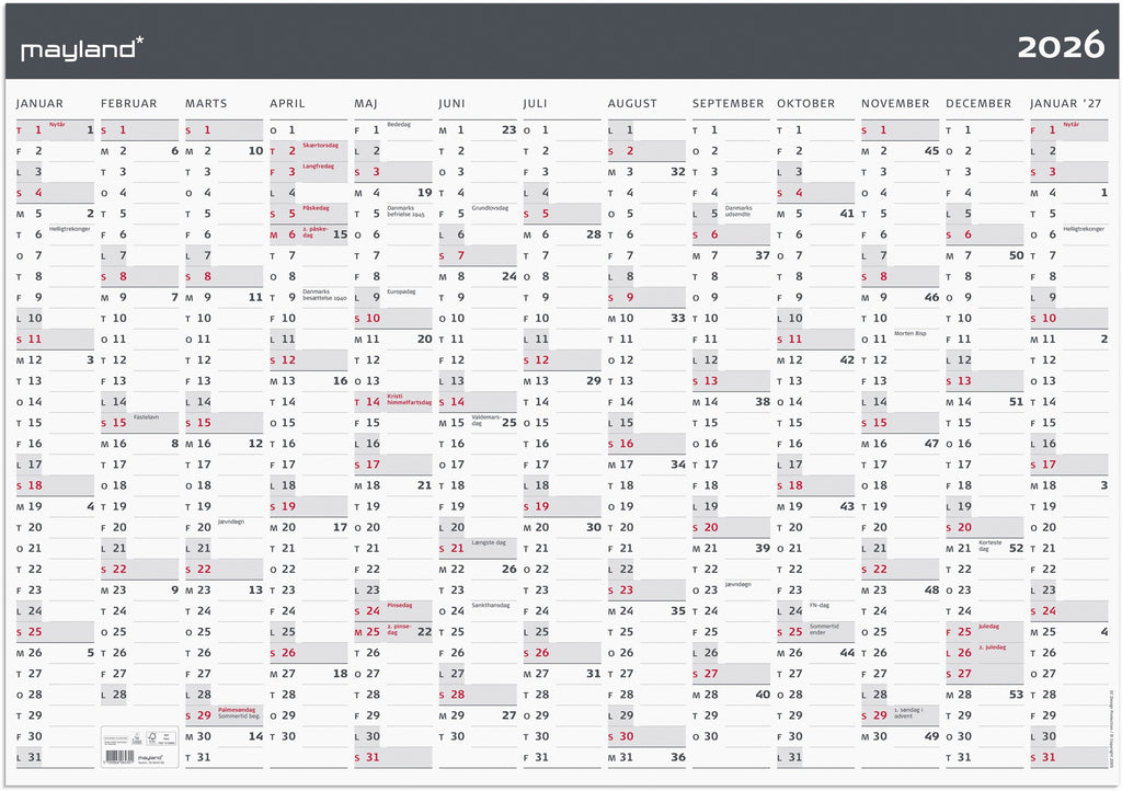 Kæmpekalender 70x100 cm i kraftigt papir og moderne design med 13 månedsoversigt. Vægkalenderen giver dig en oversigt over alle 12 måneder i året samt for januar det efterfølgende år. Med årskalenderen kan du hurtigt og nemt skabe et godt og overskueligt overblik over året og alle dets aktiviteter.