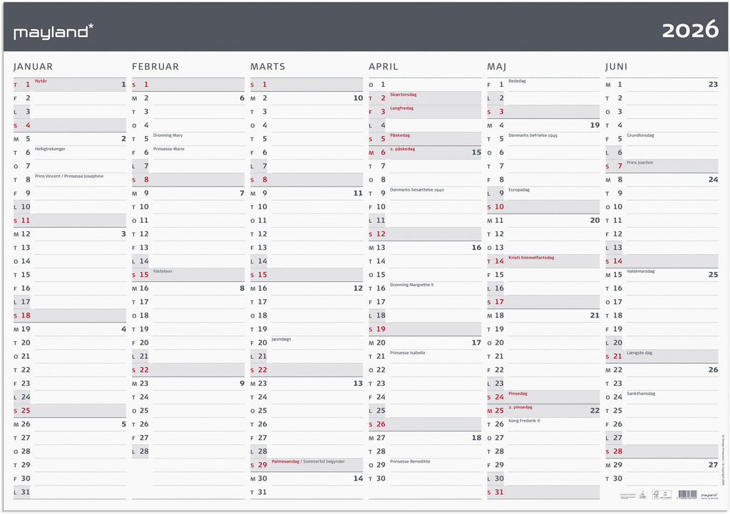 Vendbar kæmpekalender 70x100 cm i kraftigt papir og moderne design med 2x6 månedsoversigt. Vægkalenderen giver dig en oversigt med 6 måneder ad gangen, så du hurtigt og nemt kan skabe et godt og overskueligt overblik over året og alle dets aktiviteter.