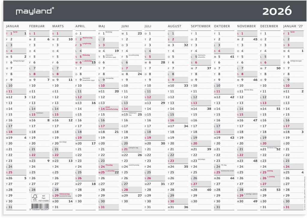 Kontorkalender i karton og moderne design med 13 månedsoversigt. Vægkalenderen giver dig en oversigt over alle 12 måneder i året samt for januar det efterfølgende år. Med årskalenderen kan du hurtigt og nemt skabe et godt og overskueligt overblik over året og alle dets aktiviteter.