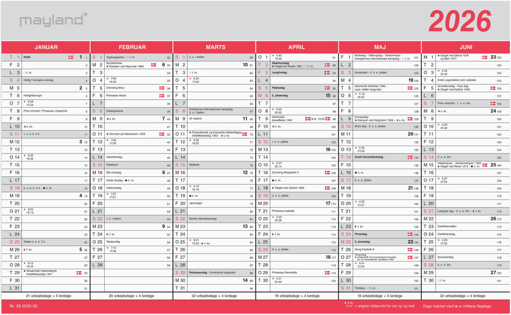 Vendbar flagkalender i karton med 2x6 månedsoversigt. Vægkalenderen giver dig en oversigt med 6 måneder ad gangen, så du hurtigt og nemt kan skabe et godt og overskueligt overblik over året og alle dets aktiviteter. Dertil viser kalenderen officielle flagdage, antal arbejdsdage pr. måned, månefaser samt solens op- og nedgangstider.