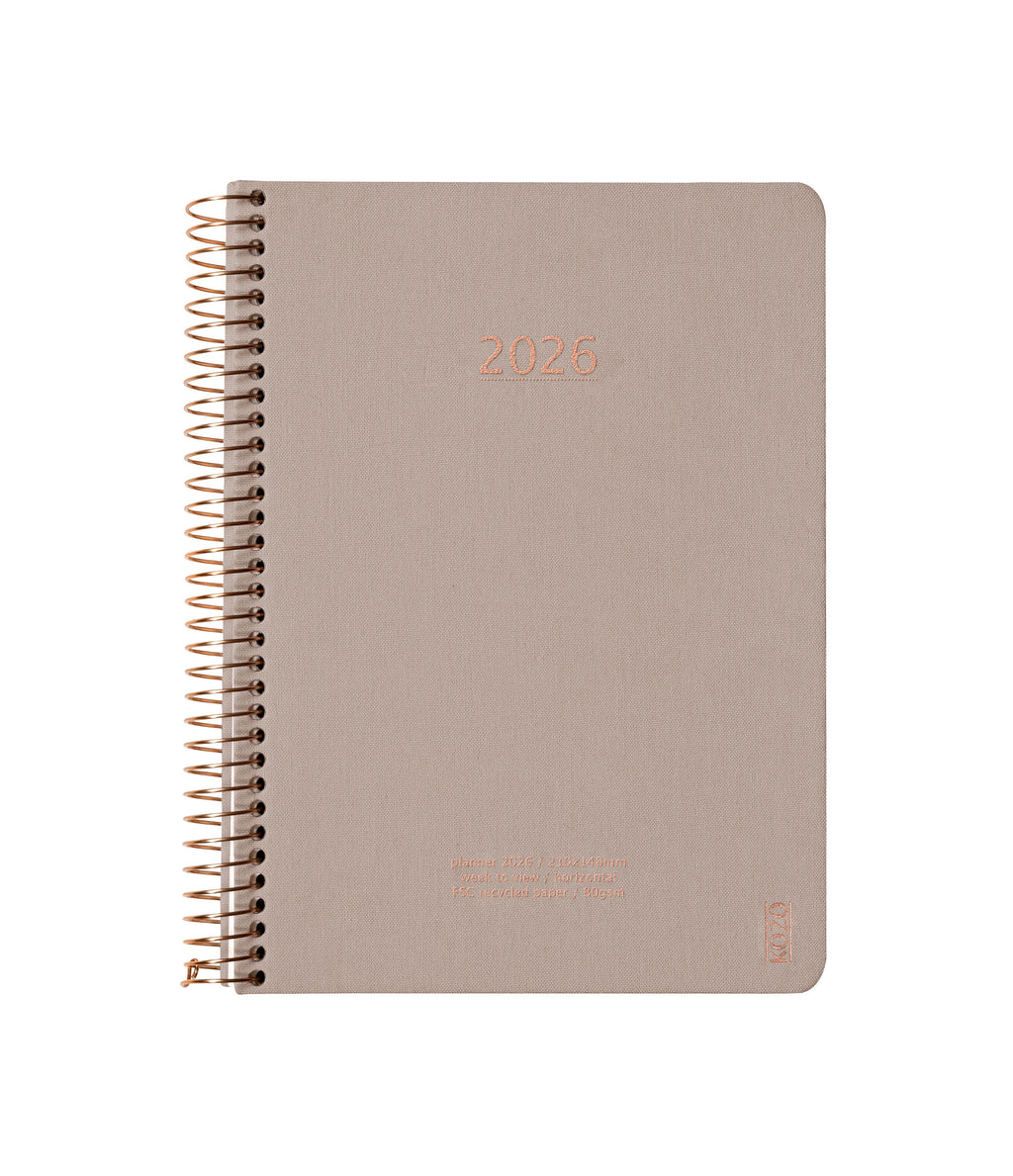 KOZO Planner 2026 er en stilren, tresproget årskalender, der hjælper dig med at holde styr på arbejde, skole og hverdag. Det slidstærke omslag og den store spiralryg gør kalenderen nem at åbne og behagelig at skrive i – også på farten. Kalenderen er trykt på elegant, cremefarvet papir og beklædt med eksklusivt lærredsstof med bronzefarvede prægede detaljer.