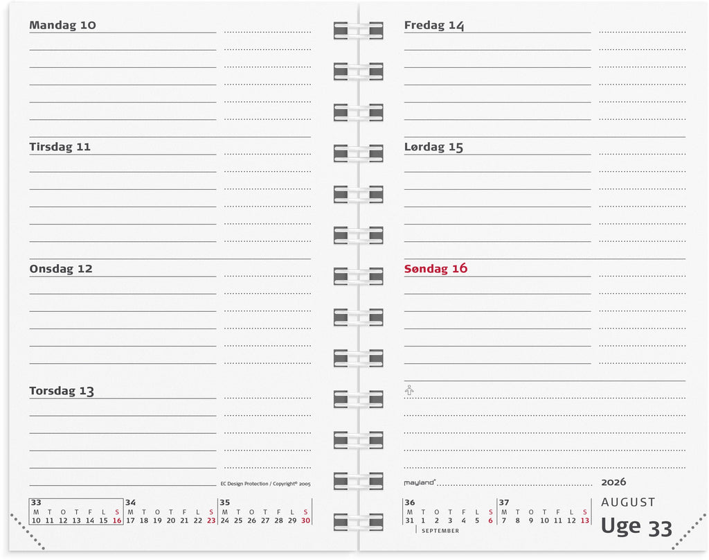 Refill til din mini ugekalender. Kalender-refillen er i tværformat og inddelt med en uge pr. opslag. Hver dag har et timeopdelt kalenderskema fra kl. 8-17, så du nemt kan danne dig et overblik over ugens planer og aktiviteter. Dertil finder du en tidslinje og månedsoversigt nederst på hvert opslag, en udfoldelig årsoversigt samt en masse praktisk information.