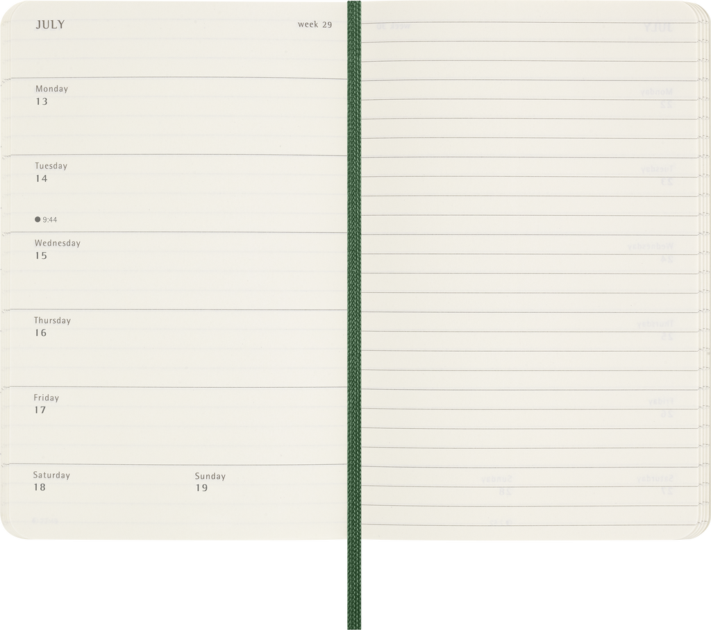 Det er nemt at få overblik over ugen med denne populære 12-måneders notebook-kalender fra Moleskine. Den er dateret fra januar til december med alle ugens dage på venstre side og plads til noter eller tegninger på højre side. Indeholder desuden års- og månedsoversigt. Designet i klassisk Moleskine-stil med runde hjørner, matchende bogmærkebånd, inderlomme til løse noter, stickers og 70 g elfenbensfarvet syrefrit papir. Fås i flere farver og størrelser.