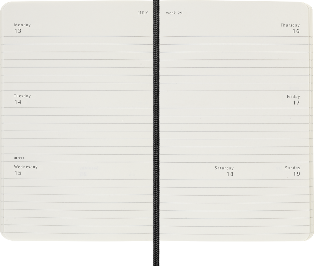 Årskalender fra Moleskine, dateret fra januar til december, med alle ugens dage på ét opslag i horisontalt layout. Indeholder års- og månedsoversigt. Designet i klassisk Moleskine-stil med runde hjørner, matchende bogmærkebånd, inderlomme til løse noter, stickers og 70 g elfenbensfarvet syrefrit papir. Fås i flere størrelser.
