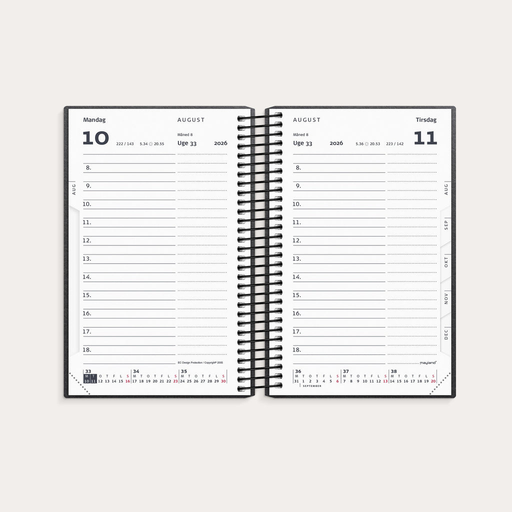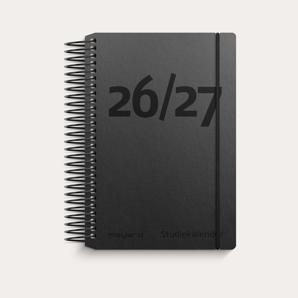 Spiralbundet minikalender til studieåret med et enkelt omslag i sort genbrugskarton. Kalenderen er opdelt med én dag pr. side og har et overskueligt, timeinddelt skema fra kl. 8 til 18.