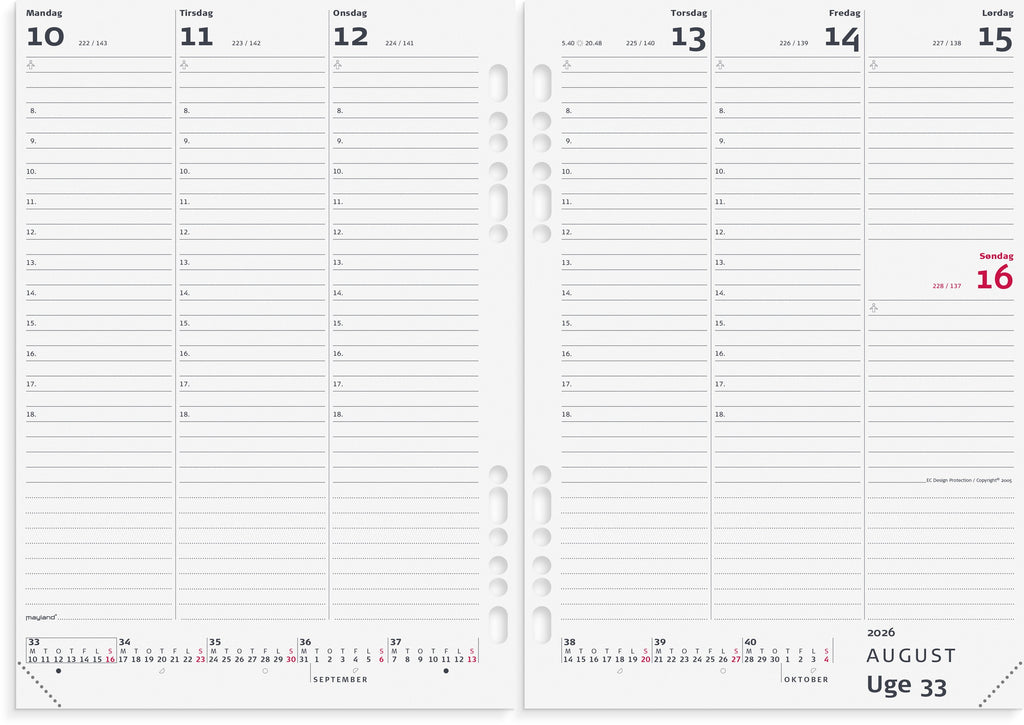 Ugekalender refill i højformat til din A5 systemkalender. Kalender-refillen har multihuller. Kalenderen er inddelt med en uge pr. opslag og indeholder et timeopdelt kalenderskema i moderne layout fra kl. 8-18, så du nemt kan overskue ugens planer og aktiviteter. Dertfil finder du nederst på hvert opslag en tidslinje og månedsoversigt. Kalenderen indeholder desuden en udfoldelig årsplanner, projektplanner, atlas i farver, masser af praktisk information, lynopslag samt separat mappe med index planner og telefonregister.