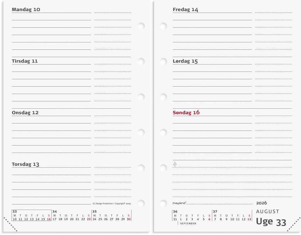 Lille og overskuelig ugekalender refill til din mini systemkalender. Kalender-refillen har en hulafstand på 19-19-19-19-19 mm. Refillen er inddelt med en uge pr. opslag i tværformat og har desuden en tidslinje og månedsoversigt nederst på hvert opslag. Dertil finder du en udfoldelig årsoversigt samt en informationsdel.