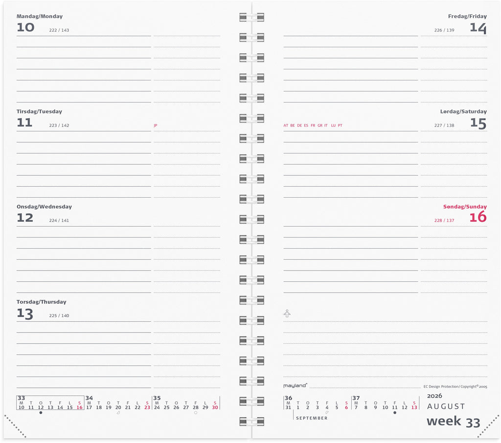 Refill til din internationale ugekalender. Kalender-refillen indeholder både danske og engelske betegnelser og tekster samt en angivelse af nationale helligdage. Refillen er inddelt med en uge pr. opslag og indeholder et timeopdelt kalenderskema fra kl. 8-16, så der er masser af plads til at skrive dagens planer og aktiviteter. Dertil finder du en tidslinje og månedsoversigt nederst på hvert opslag og en udfoldelig årsoversigt.